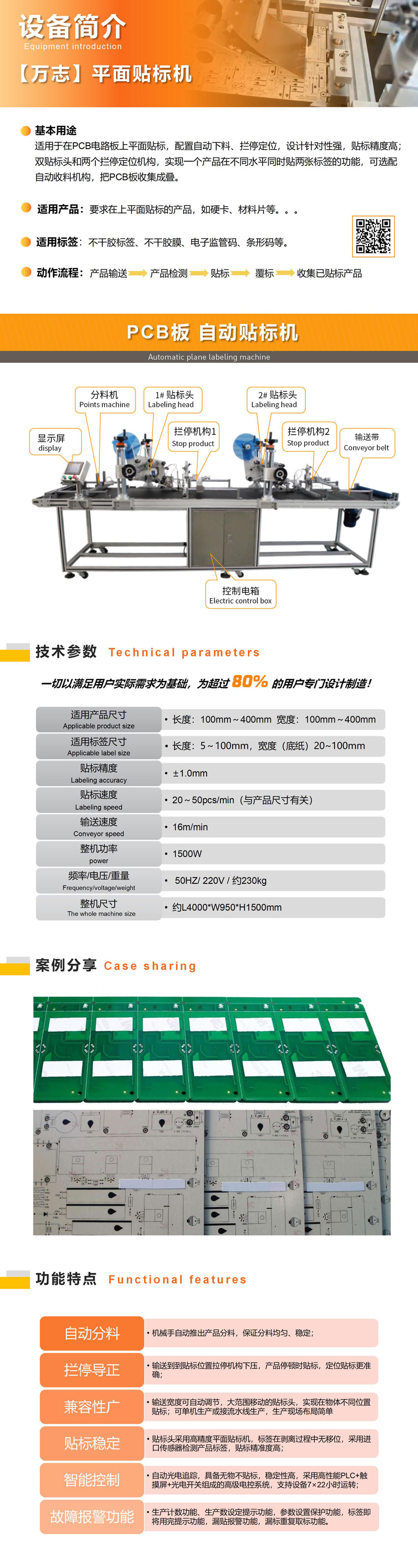 適用于在PCB電路板上平面貼標,配置自動上料、攔停定位貼標精度高。雙貼標頭和兩個攔停定位機構,實現一個產品在不同水平同時貼兩張標簽的功能;可選配自動收料機構,把PCB板收集成疊。