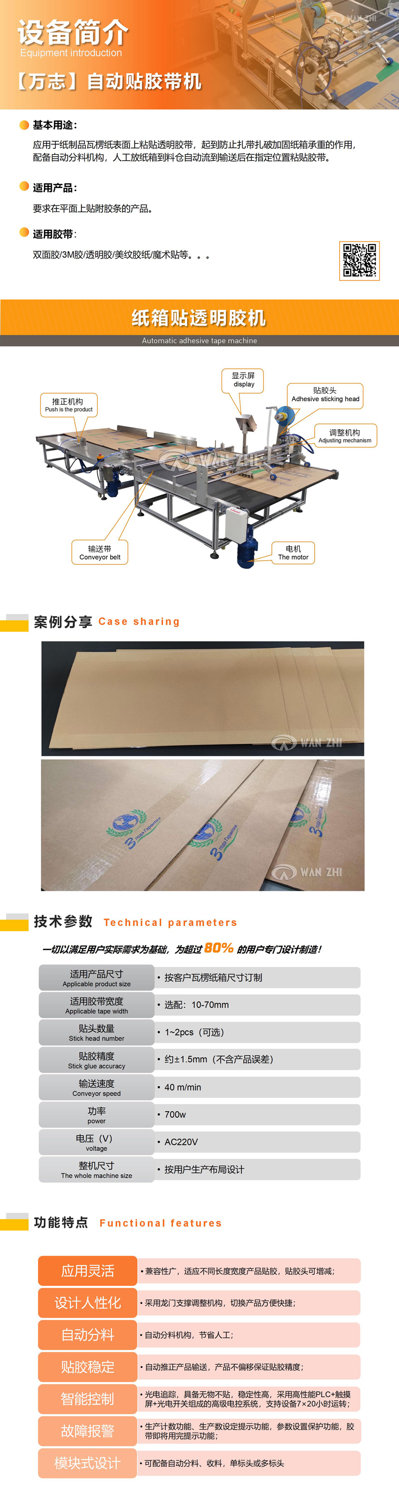 應用于紙制品瓦楞紙表面上粘貼透明膠帶,起到防止扎帶扎破加固紙箱承重的作用,可配備自動分料機構,人工放紙箱到料倉自動流到輸送后在指定位置粘貼膠帶。適用于在各種物品的上平面粘雙面膠/3M膠,根據貼膠長度要求自動裁切;如海報、紙卡、盒子、袋子等;可結合產品考慮選配自動送料機構,自動收料機構等 ,取代人工更高效。