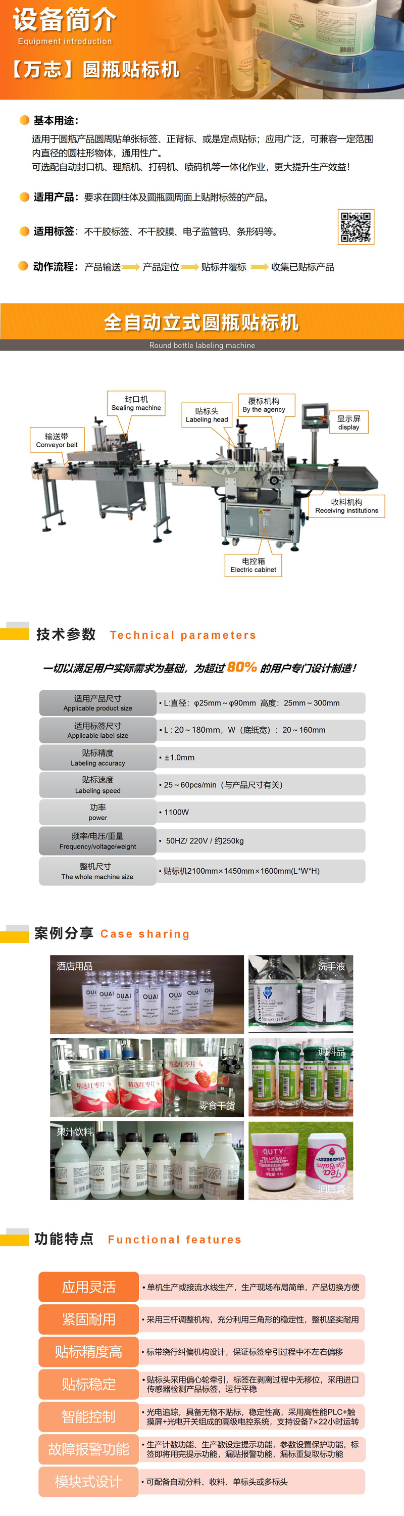 全自動圓瓶貼標(biāo)機適用于在圓瓶類物體圓周面貼標(biāo)簽,可貼單標(biāo)和雙標(biāo),正背雙標(biāo)間距可靈活調(diào)整,如zheli喱水圓瓶、食品圓罐等貼標(biāo),廣泛應(yīng)用于化妝品、食品、醫(yī)藥、消毒水等行業(yè)。選配圓周定位檢測裝置,可實現(xiàn)在圓周面指定位置貼標(biāo)。可根據(jù)需求選配色帶打碼機、噴碼機和封口機等;