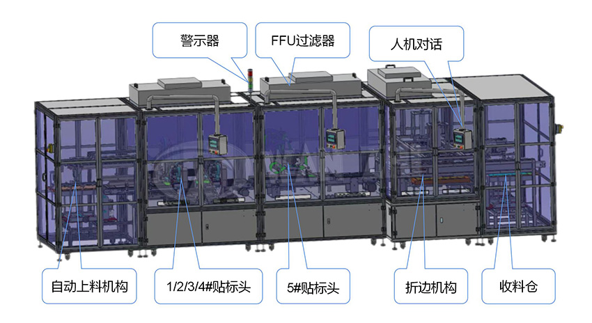 生產流程:料倉自動吸取產品→輸送帶將產品送至貼標機構→5個高精度貼標頭貼標→搬運模組把產品移到壓合機構→壓合氣缸下行→壓合完成→模組自動收料;